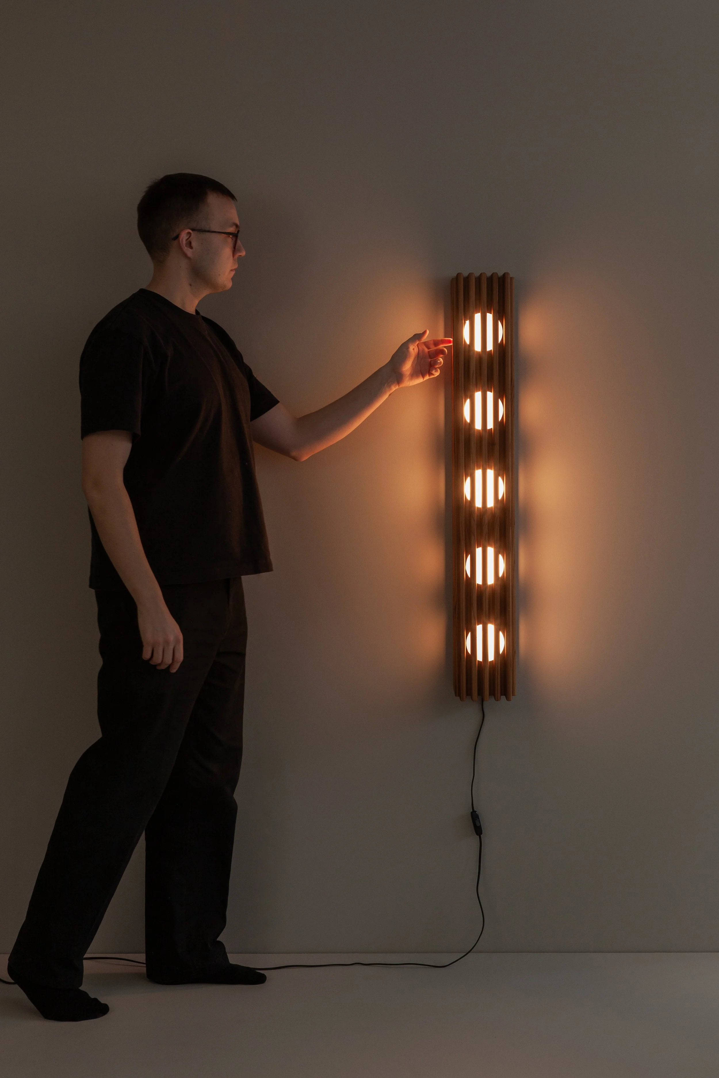 A vertical structure of heat-treated pine, shaping light into a calm, ambient presence. It focuses on how light interacts with structure and wood to create a warm, calm atmosphere that supports everyday living.