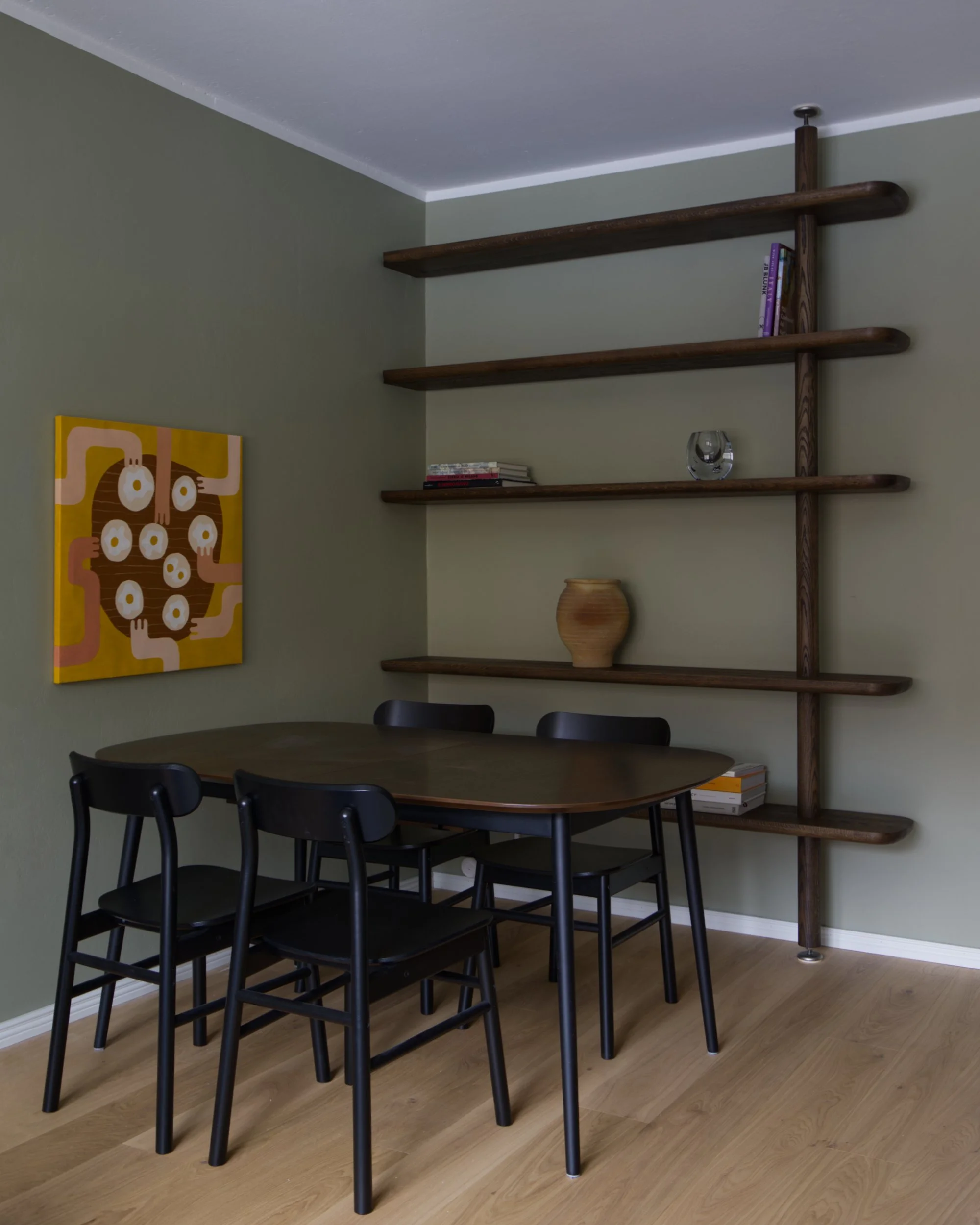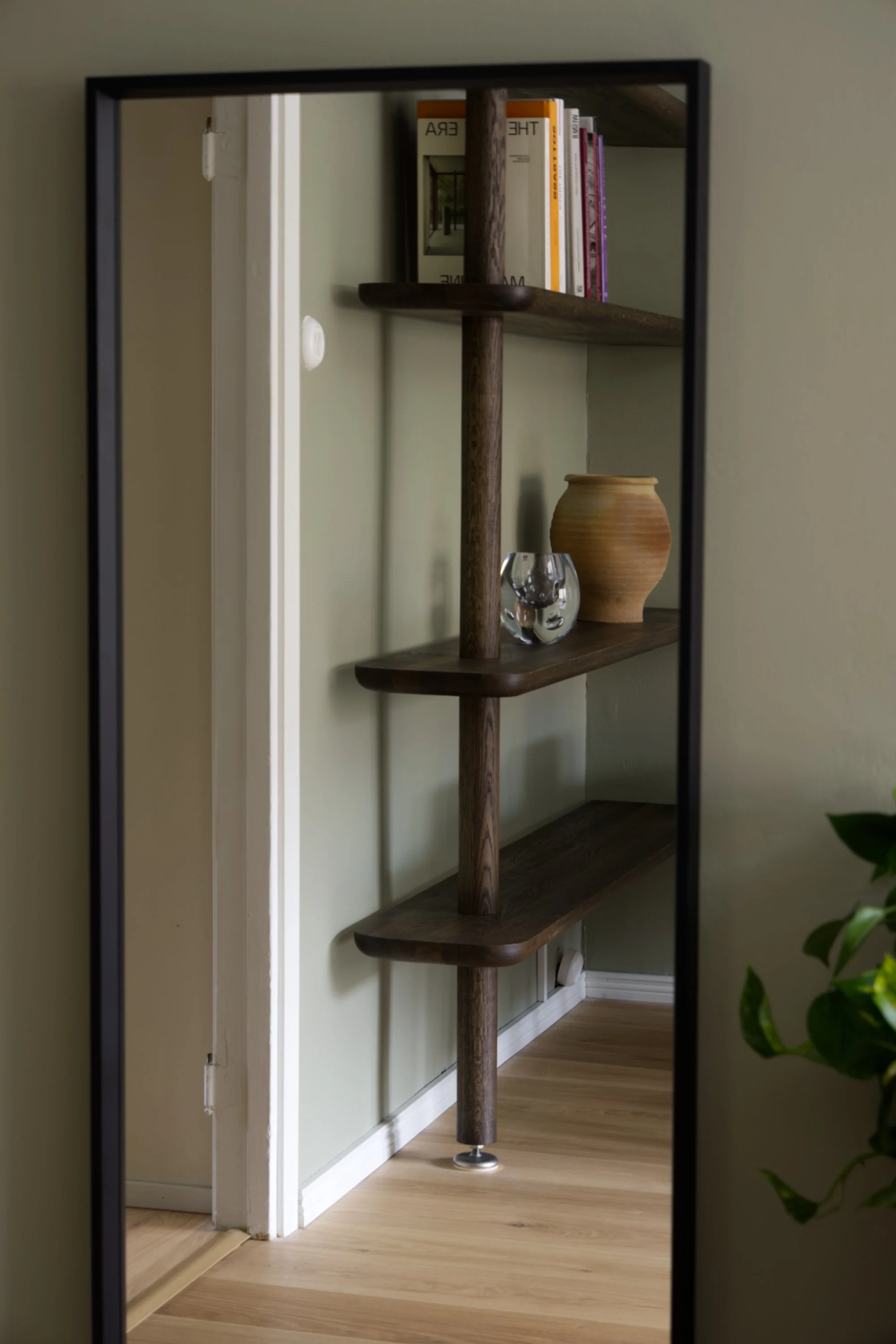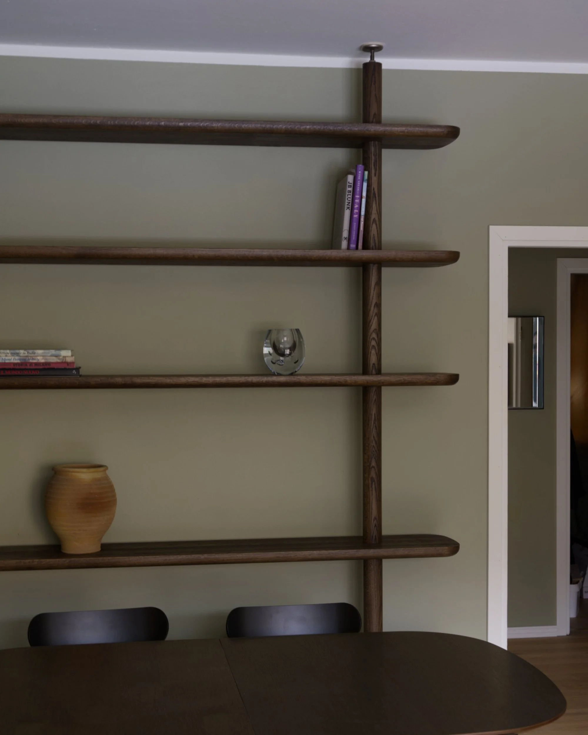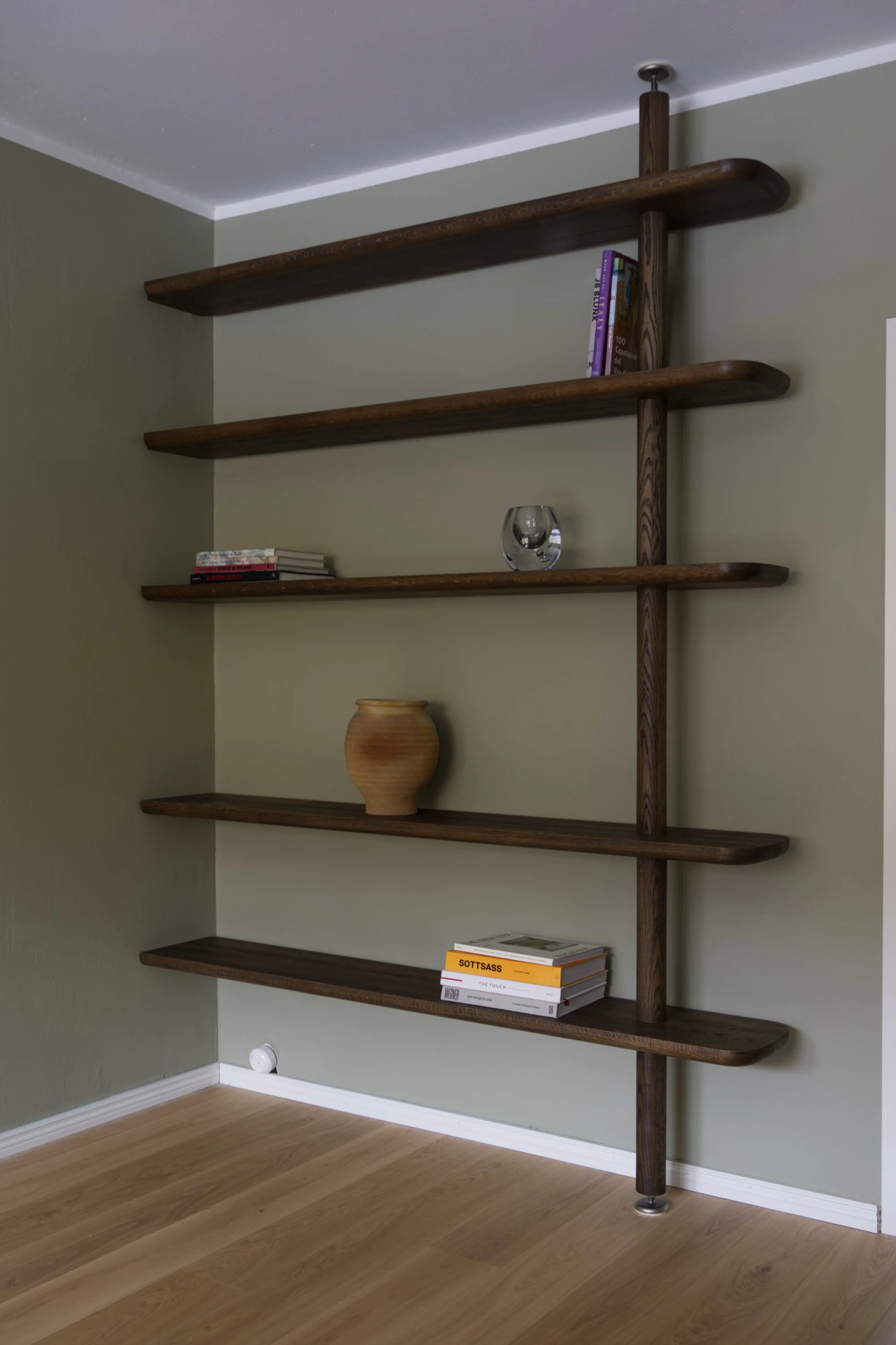 The task was to design an open shelving with soft forms using a central pole to connect the shelves together. The middle part of the shelf was left more open to be used as a display shelf for precious items and art works. Using adjustable feet the structure is compressed between the floor and ceiling on one end and attached to the wall on the other end.