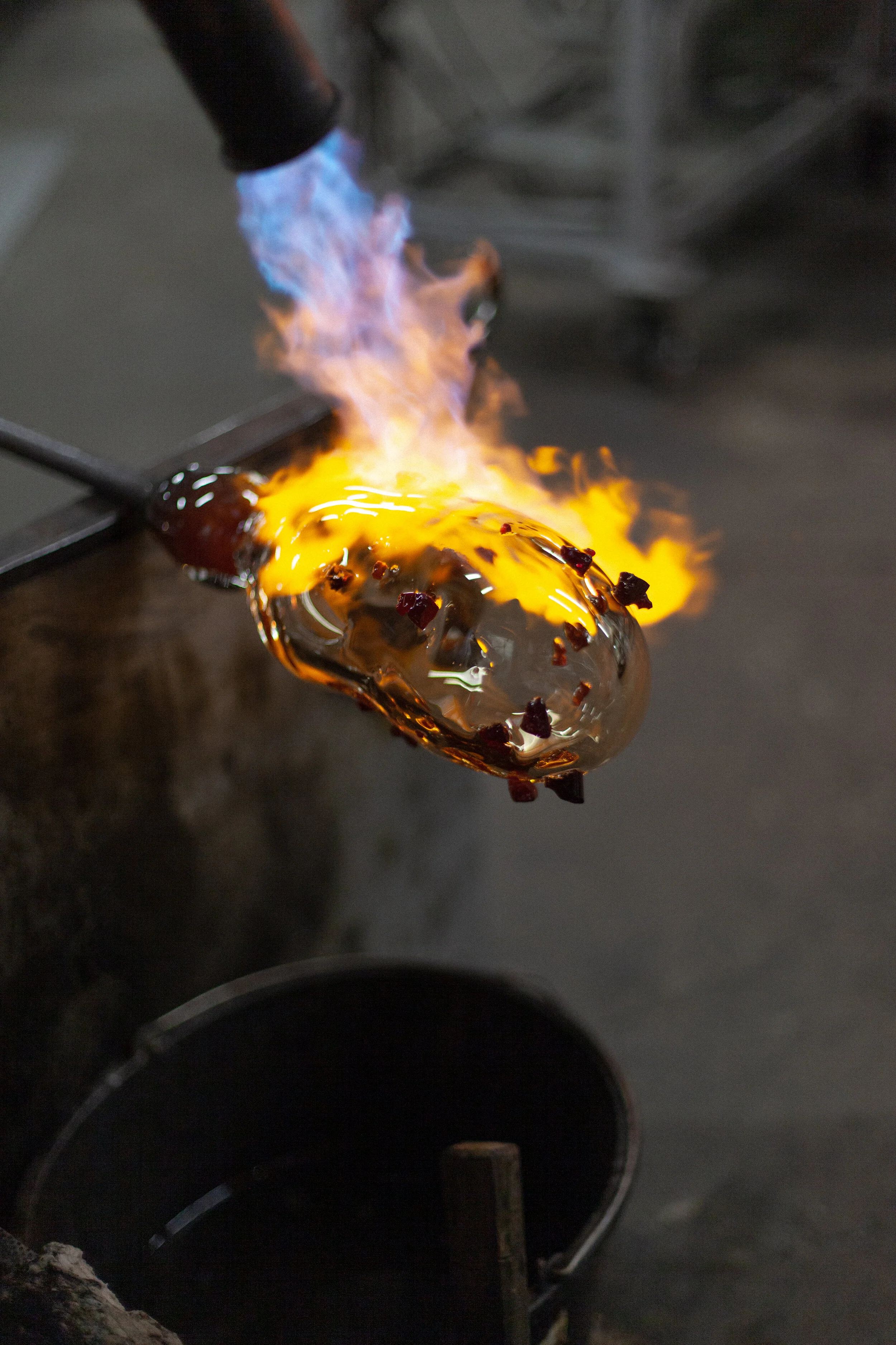 Born in the speed of the hotshop. Watching glassblowers Teemu Kylvö and Otto Koivuranta work I had an idea that we could try to ”glue” these raw chunks of glass to the ”bubble”. So I chose a few tasty colors and we tried. And it worked!